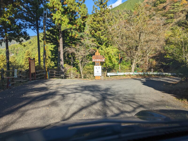 おそるおそる入ってみると、これまでの山中のドライブからは想像できないほどの広さの駐車場がありました。空中の村は21世紀の森・紀伊半島森林植物公園内にあるため、この駐車場に停めて散策スタート!