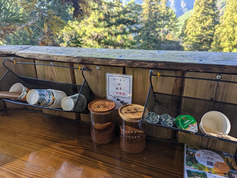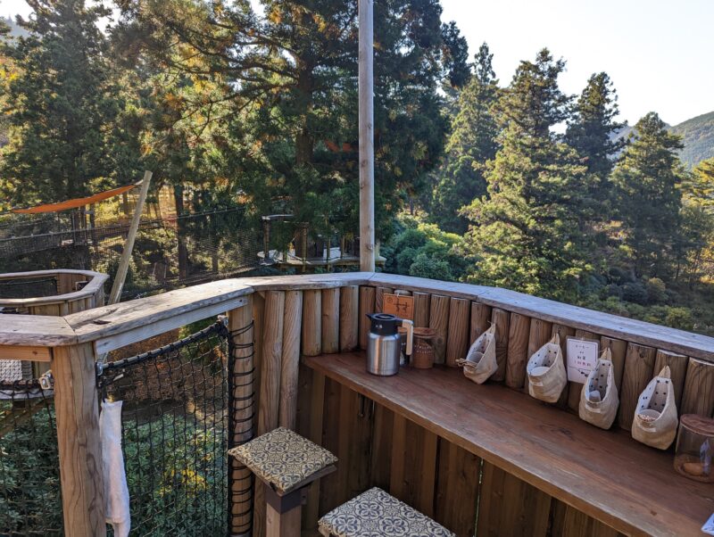 あたたかいオーガニックドリンクも提供されています。ドリンクカウンターのあるツリーハウスは3棟ありました。空中の村の地上を見下ろしながらのティータイムです。