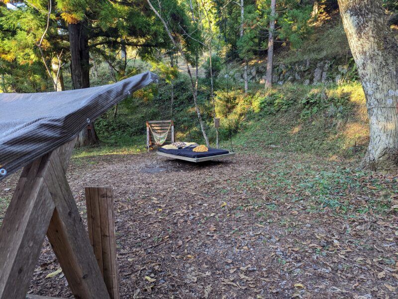 地上にもリラックススペースが各所に設置されています。ベッド型のブランコ、テレワークスペースと名付けられたあずまや、吊り下げられたテント…